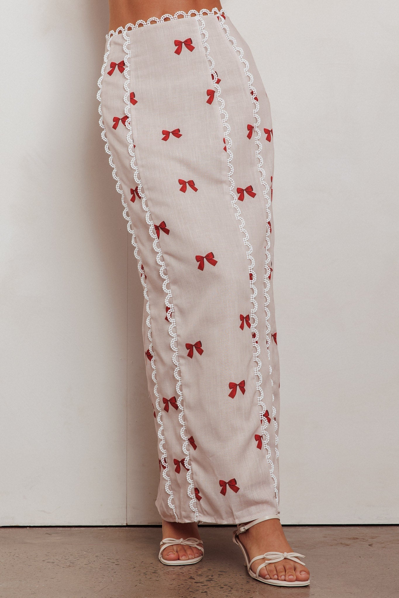Breeze through the weekend in our chic Chamberlain maxi skirt. We are obsessed with its scalloped lace trim and classic silhouette. Perfect for a holiday season brunch with your girls teamed with its matching crop top. kitten heels and a saddle bag for a gorgeous look that will turn heads.