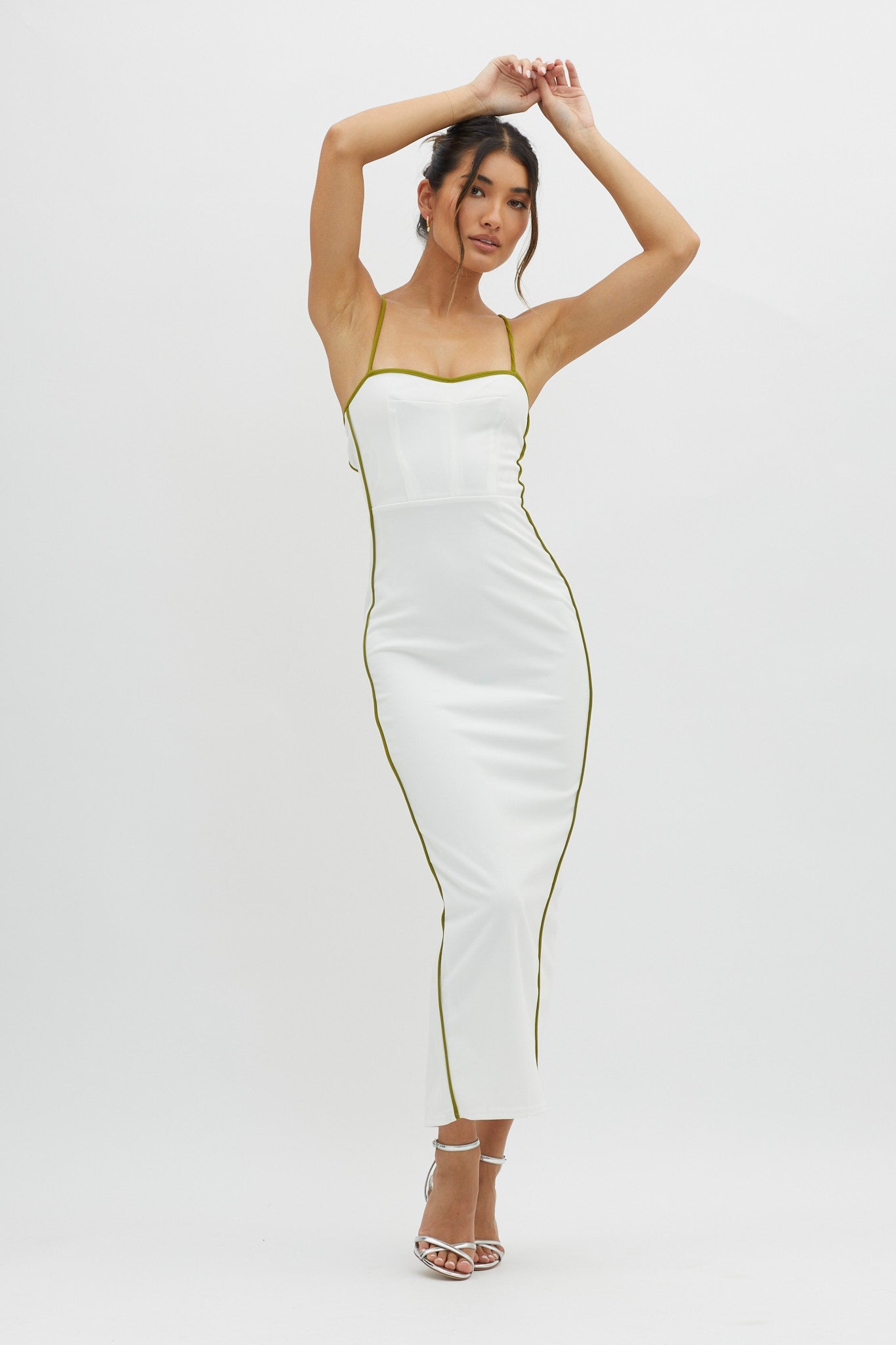 Steal the show in our hot Future Awaits midi dress. We are obsessed with its piping trim detail and open. lace-up back. Perfect for a flirty date night with your crush. Team it with strappy heels and a baguette bag for a super cute look.