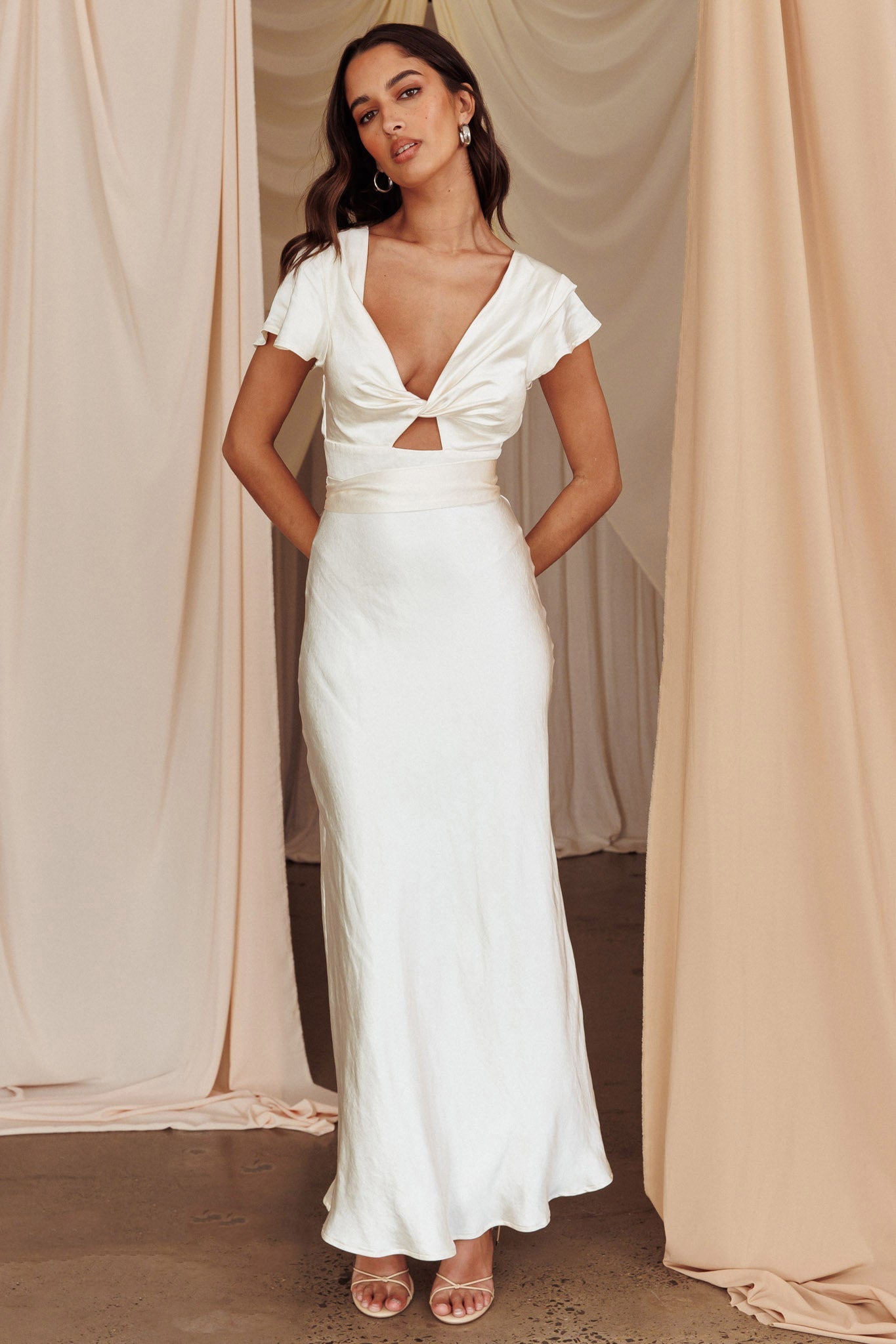 You will be flooded with compliments in our dreamy Irena maxi dress. It features short. flutter sleeves and a twist detail in the bust. It's perfect for bridal events or a special occasion celebration. Team it with strappy. tie -p heels and a clutch for a look that will turn heads.