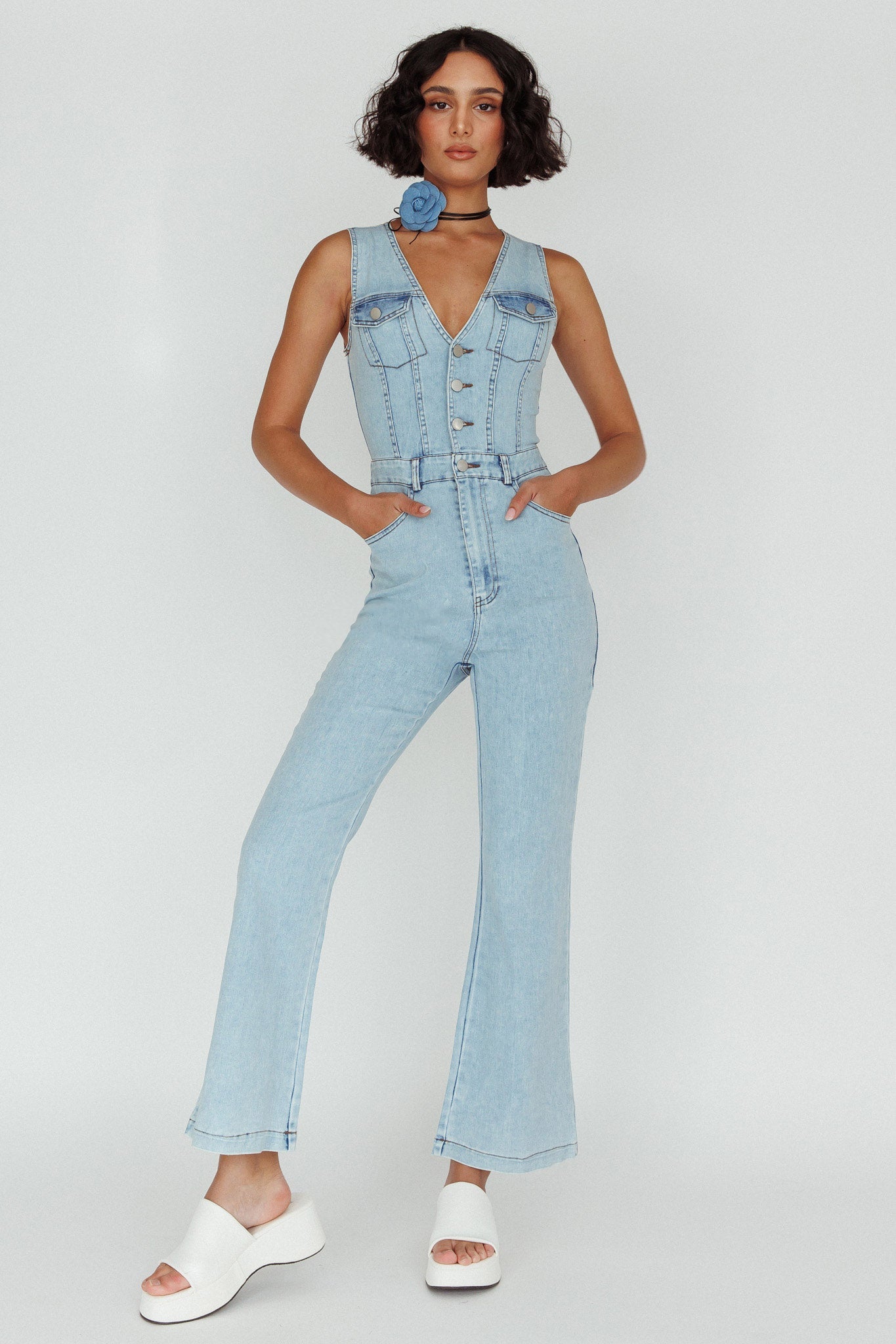 Heads will turn when you walk by in our super cute Jazelle jumpsuit. We are majorly crushing on its vest-style bodice and slight flare in the leg. Perfect for a fun date night teamed with platform mules and a tote for a playful look.