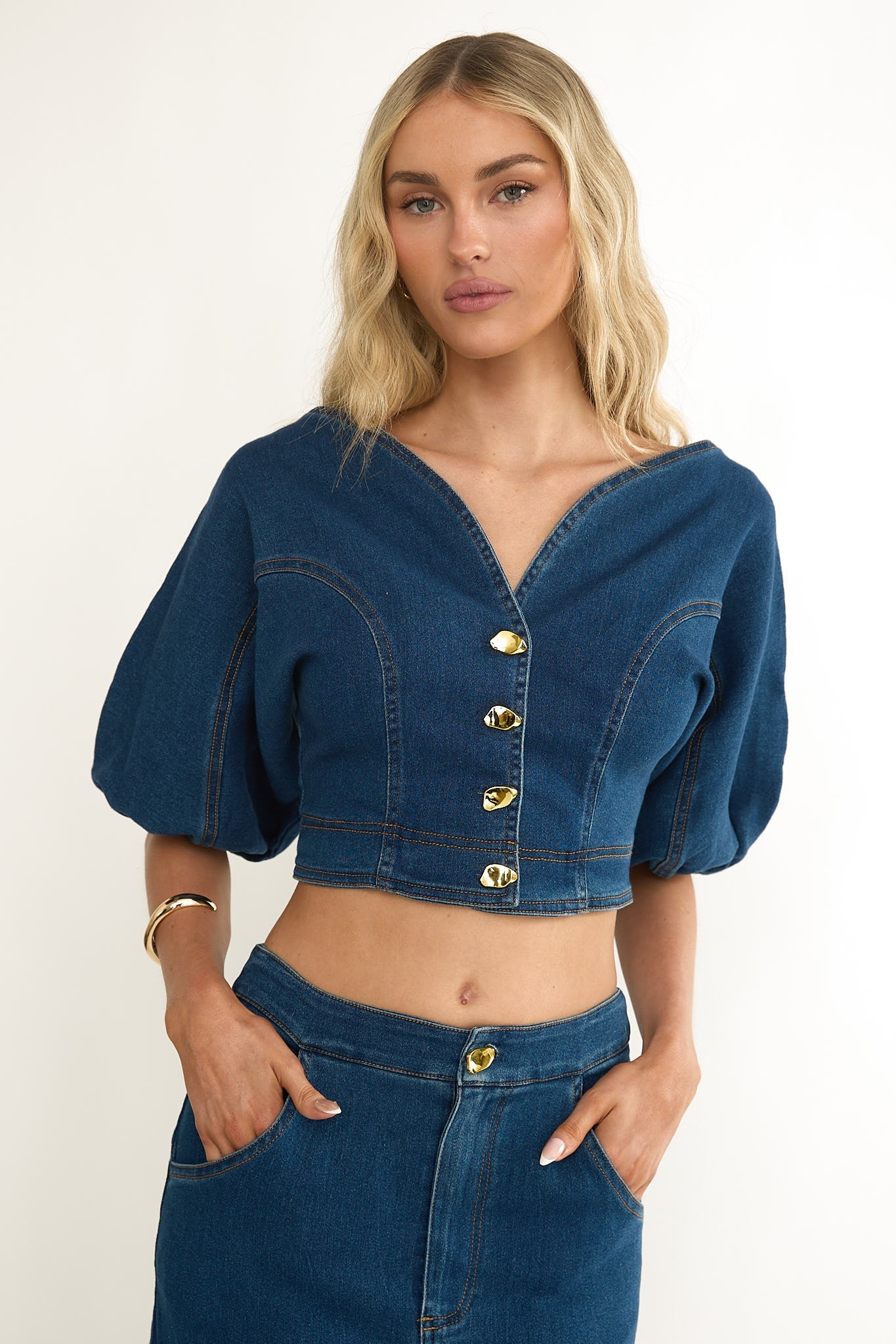 Twirl the weekend away in our pretty Kaelis top. It features bubble sleeves and gold buttons. It's perfect for Sunday brunching with your besties. Team it with its matching skirt. sandals and a tote for an unforgettable look.