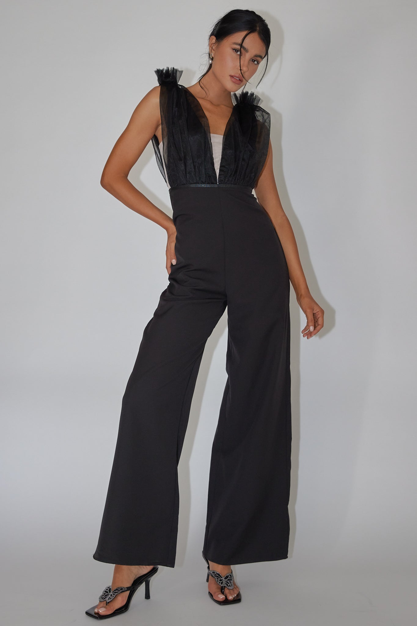 Turn heads in our chic Lovinia jumpsuit. We are in love with its mesh bodice feature and shoulder accents. It's perfect for a wedding or glam girls night out. Team it with strappy. black heels and a clutch for a look we are loving.
